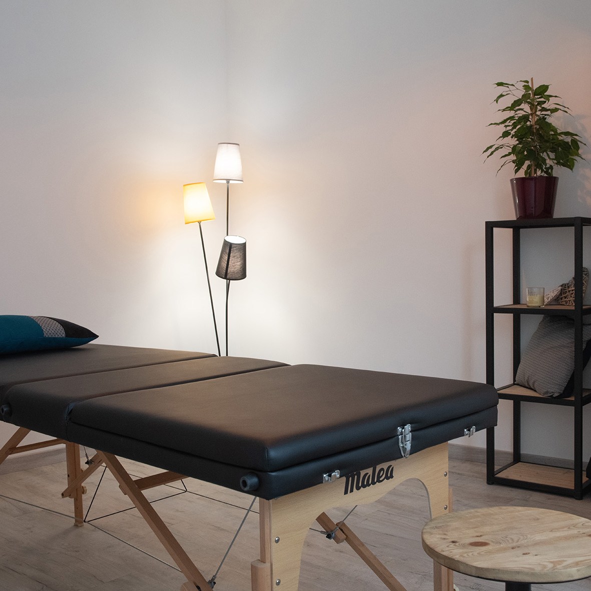 Vous vous allongez sur la table de massage, habillé(e) mais sans chaussure .